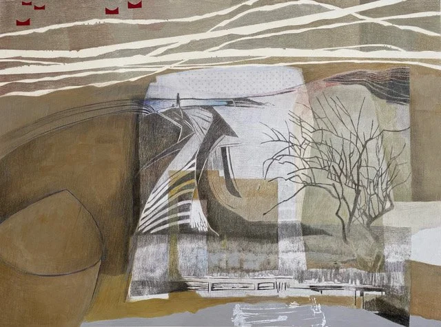 Denise’s work whilst never directly figurative, the images often suggest where people have been : the apparent inconsequential traces left by man : the shadow of human habitation “ island life and journeys that we make both ‘inner’ and ‘outer’ are recurring themes.