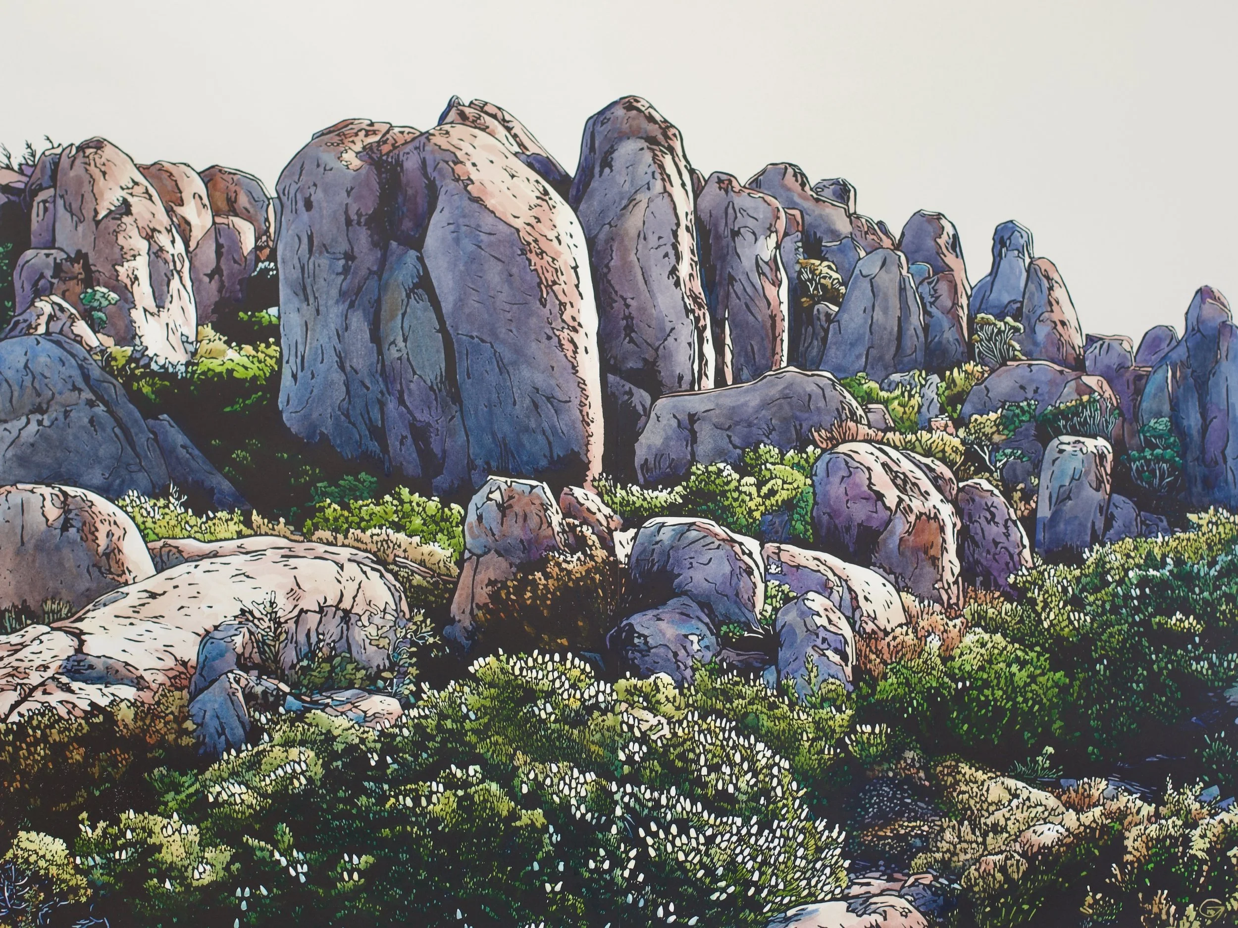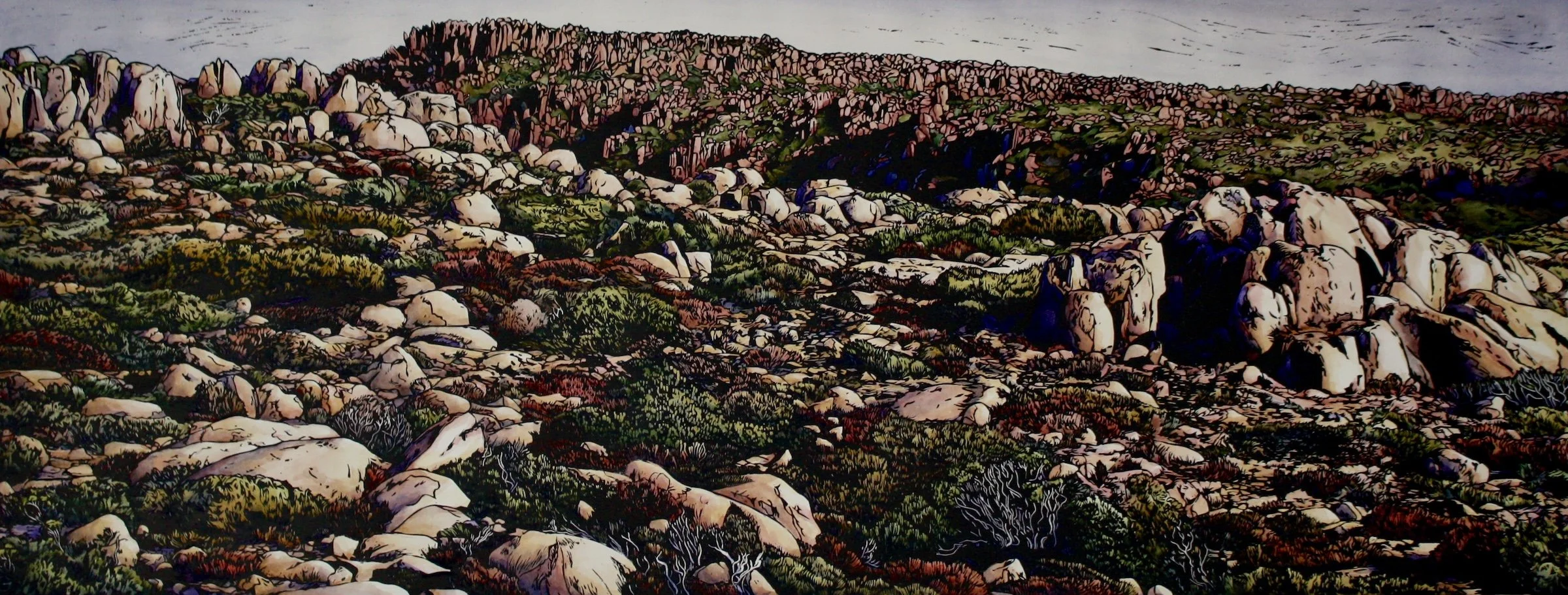 Grace Gladdish is an artist living in Tasmania who’s work relies heavily on printmaking processes. Grace studied art in Brisbane in the nineties, and her early practice was based there. A move to turrakana/Tasman Peninsula in 2009 to run a native flower farm, saw a major shift in my current practice consists mostly of printmaking and works on paper. I explore Tasmania's wild alpine landscapes through relief printing and hand paint all my linocuts with watercolour, creating hybrids that straddle the disciplines of both painting and printmaking.